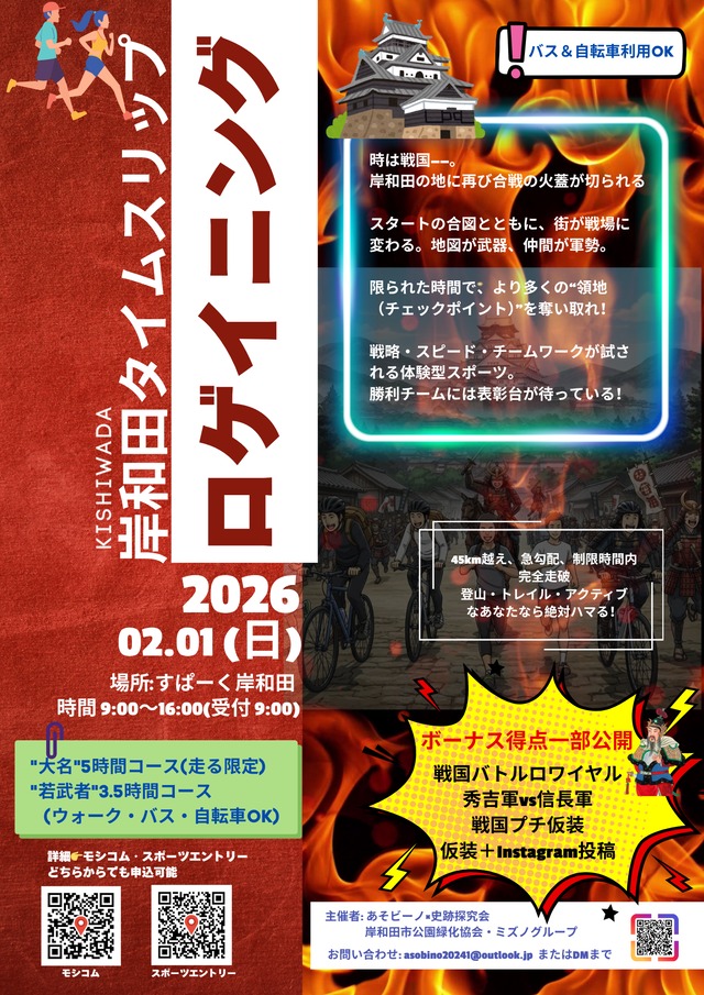 ⚠️こちらは若武者コース一般対象チケットになります。 大名コース(ハード・走る限定) 岸和田の町から山へ、標高差587m・45km超の本格ロゲイニング。史跡を巡り己の限界に挑む戦国級チャレンジ。 若武者コース(ライト・初心者歓迎) 町中や城下をめぐる入門コース。初めてやファミリーも安心、バス・自転車利用可。 ゴール後は「岸和田バトルロワイヤル」&「秀吉軍vs信長軍」の激戦が待つ! ■大名コース(ハード・走る限定) 岸和田の町から山へ、標高差587m・45km超の本格ロゲイニング。史跡を巡り己の限界に挑む戦国級チャレンジ。 ■若武者コース(ライト・初心者歓迎) 町中や城下をめぐる入門コース。初めてやファミリーも安心、バス・自転車利用可。 □開催日 2026年2月1日(日) 雨天決行・ 荒天中止 □日時 9:00~16:00 □場所 すぱーく岸和田 電車でご来場の場合 ・JR阪和線「久米田」 駅徒歩20分 ・南海空港線「春木」駅徒歩20分 バスでご来場の場合 ・地域巡回ローズバス 北ループ 小松里町北「総合体育館」下車8分 自動車でご来場の場合 ・まなび中央公園駐車場450台 □参加費 大名部門 5時間 2,800円(大人) 1,500円(小中学生) 12/25迄早割1,000円引き 若武者部門 3.5時間 2,000円(大人) 1,500円(小中学生) 12/25迄早割1000円引き ・早割期限:2025/12/25 まで □参加資格 小学生以上(小中学生は必ず 保護者とご参加ください。) チーム単位(1~3人)エントリー □定員 大名部門 30チーム 若武者部門 30チーム 合計60チーム □参加ルール ★チーム(1~3人のチームでご参加いただけます。) □大名部門(走る限定) 得点規定 ・男1名、男性チーム:得点×1.0 ・男女混合チーム、男小学生含むチーム :得点×1.1 ・女1名、女性チーム、女性小学生含む チーム:得点×1.2 □若武者部門 ウォーク、バス、自転車で お好みの速さで若武者チャレンジ! ★得点率変わらず ★交通機関をご利用の際は各自、運賃別途 お支払いお願いします。 その他、自動車、タクシーの移動手段は禁止。不正発覚時に失格となります。 ■スケジュール 大名部門 5時間 9:00 受付開始 9:20 開会式・競技説明 9:40 競技スタート 14:40 フィニッシュ 15:00 集計(若武者部門と合流) ゲーム開始 戦国バトルロワイヤル 信長軍vs秀吉軍対決 16:00 表彰式・閉会式 若武者部門 3.5時間 10:30 受付開始 10:50 開会式・競技説明 11:10 競技スタート 14:40 フィニッシュ 15:10 集計(大名部門と合流) ゲーム開始 戦国バトルロワイヤル 信長軍vs秀吉軍対決 16:00 表彰式・閉会式 ※当日の運営都合上、時間のズレにご了承ください。 □持ち物 撮影可能スマートフォン必須、 筆記用具、飲み物、健康保険証、 モバイルバッテリー必須、雨具 □服装 動きやすい服装(更衣室あります)、 シューズ □表彰式 上位、その他では大名、若武者、 町娘、武将などあり ▲ちょびっと仮装でボーナスゲット! ▲仮装×インスタでさらに3倍ボーナス ゲット! などボーナスミッションも 盛り沢山! □ルール ・地図を元にチェックポイントをまわり、 制限時間内に獲得した点数を競います。 ・作戦タイムは時間制限なく、自由にでき ます。 ・ミッション、チェックポイントの難易度 が高いポイントほど高得点にになります。 ・ゲーム終了時刻に遅れた場合、1分につき 50点のマイナスとなります。 3分以上遅刻した場合は失格になります。 ・合計得点が同じ場合、会場に戻ってくる 際のタイム順が早いチームが上位になり ます。 ・バス、自転車利用ok。 ・自動車、タクシーなどの移動手段を使った 場合は失格です。 (ただし車いす、電動カート、リフトは大歓迎) ・地図またはアプリ使用 ・参加者は安全、体調管理には十分ご配慮 ください。 主催者プライバシーポリシー イベント上、予告、通知なく変更改定することがあります。その際は改定後の本利用規定に同意したものとみなします。 ご利用される前に、必ず本利用規約をお読みください。 ★申込者のご入金確認をもって、イベント エントリー完了とさせていただきます。 インターネット回線の不具合、操作の何 らかの理由により、申込手続きの完了確認 についてはメールよりお問い合わせくださ い。 ★申込期間により割引適用することがあり ます。割引適用期間が過ぎますと通常価格 になりますので、ご了承ください。 ★申込代表者によって同チームのメンバー、 その他のチームの申込手続を行うことがで きます。 申込代表者はあらかじめすべての 利用者に本イベント情報、利用規約に同意 を得た上で利用者全員の情報をご登録お願 いします。 ★本大会においての緊急連絡などは申込代表 者のみに送信されますのでご注意くださ い。 ★申込情報にメンバー変更、増員が発生した 場合は、変更、増員が必要となるメンバー の氏名、性別、生年月日、住所、連絡先を ご記入のうえ、メールよりご連絡くださ い。 追加料金が発生する場合は、振込での お支払いを別途ご案内いたします。 (振込手数料は申込者の負担となります。) ■ 申込者の都合においてのイベントキャンセ ルされる場
