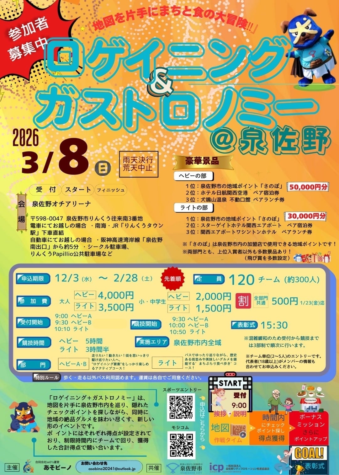 ⚠️こちらは小中学生・ライト早割1/23迄のチケットとなっております。 ⚠️2〜5人/チームの募集となります。 お一人様のご参加は不可となります。 ロゲイニング&ガストロノミー@泉佐野 ■概要 初開催!“関空の玄関口”である泉佐野市を舞台にした、まったく新しい 「地図を片手に、まちと食の大冒険」 関空の対岸都市・泉佐野市が持つ多様な魅力を、あなたの足と舌で探求するロゲイニング&ガストロノミーの融合イベントがここに誕生! バスの活用OK! 泉佐野の“多面的な魅力”を体験! 【シーサイドエリア】人気の商業施設が立ち並ぶりんくうタウンなどの賑やかな海辺。 【山間部エリア】「修行の聖地」犬鳴山を含む緑豊かな自然と歴史。 【市内中心部】 交通至便で、快適な都市型ホテルを有するエリア。 歩いたり、走ったり、そしてバスを乗り継ぎながら、まるで宝探しのようにまちを巡るロゲイニングで泉佐野の「いろんな顔」を全身で感じてください! 走りたい、動きたい、街を思いっきり駆け巡りたい方向けの「ヘビーの部」 バスでゆったりと巡りながら、歴史ある街並みや美味しいグルメを堪能したい方向けの「ライトの部」 ご自身の楽しみ方によって、部門をお選びください。 ◎地域のグルメを堪能!「美食」のガストロノミー体験 海と山に囲まれた「食材の宝庫」と呼ばれる泉佐野。 本イベントでは、単に走る、歩くだけでなく、「美食」を意味するガストロノミーの要素をプラス! 『500円飲食クーポン券付き・各協力飲食店舗半額メニュー』など 食べ歩きから多国籍のランチまで市内の複数の飲食店やテイクアウト店のメニューや自慢の一品を、ポイントとして巡りながらお楽しみいただけます。 ◎豪華景品 入賞者には、泉佐野市内の地域ポイントである「さのぽ」のポイントのほか、ホテルの宿泊券やお食事券など、泉佐野を満喫できる豪華賞品を多数ご用意。 また、「飛び賞」、参加賞「泉州タオル」もご用意しておりますので、上位入賞者以外の方も、当選する確率が高いのが特徴です。 ■開催日 2026年3月8日(日) ■受付・スタート・フィニッシュ 泉佐野オチアリーナ (りんくうプレジャータウンシークル2F) 〒598‐0047 泉佐野市りんくう往来南3番地 ◎電車にてお越しの場合 南海・JR「りんくうタウン駅」下車直結 ◎自動車にてお越しの場合 阪神高速湾岸線「泉佐野南出口」から 約5分 シークル駐車場、 りんくうPapillio公共駐車場など ■参加費 ◎大 人 ヘビー4,000円 ライト 3,500円 ◎小・中学生 ヘビー2,000円 ライト 1,500円 ※割引 1月23日㈮までのお申込みで全部門共通500円引き ■申込締切 2026年2月28日(土) ※応募者多数の場合は、期間中であっても締め切る場合があります。 ■定員 120チーム(約300人) ※1人でのお申し込みはできません ※代表者様が全ての参加者のチェットをお申込み頂けます。(2〜5人/チーム) ■持ち物 撮影用スマートフォン、筆記用具、 飲み物、モバイルバッテリー、雨具 ■服装 動きやすい服装、シューズ、雨具 ■表彰式 上位入賞者、特別賞など複数予定 (上位入賞者以外にも「飛び賞」 「泉州タオルの参加賞」を多数設定) ■スケジュール 【受付開始】 9:00 ヘビーA 9:30 ヘビーB 10:10 ライト 【競技開始】 9:30 ヘビーA 10:00 ヘビーB 10:50 ライト 【表彰式】 全部門共通 15:30 ■競技時間 ヘビー(5時間) ライト(3時間半) ■実施エリア 泉佐野市内全域 ■部門 「ヘビー」:走りたい、動きたい、街を思いっきり駆け巡りたい方向け(アクティブなチーム向け) 「ライト」:バスでゆったりと巡りながら歴史ある街並みや美味しいグルメを堪能したい方向け(マイペースで冒険するチーム向け) ■ルール ・地図をもとに、チェックポイントをまわり、制限時間内に獲得した点数を競います。 ・参加者にはスタート前に、地図、チェックポイント、ミッションを記載した用紙を配布します。 ・作戦タイムは時間制限なく、自由にできます。 ・チェックポイントでは、スマートフォンを用いて、撮影者以外のチーム全員が入るように撮影してください。 ・撮影しているチェックポイントの写真と距離、状態、写真に入る風景がすべて同じ状態でない場合はNGとなります。 ・ミッション、チェックポイントの難易度が高いポイントほど高得点になります。 ・ゲーム終了時刻に遅れた場合、1分につき50点のマイナスとなります。 ⚠️3分以上遅刻した場合は失格となります。 ・合計得点が同じ場合、ゴールのタイムが早いチームが上位になります。 ・全部門とも、いずみさの観光周遊バス(運賃無料)や路線バスを利用可能。自動車や自転車、タクシーなどの移動手段を使った場合は失格です。ただし、車いす、電動カートは可。 ・地図サイズ:A3版1枚+その他 (予定、変更の可能性あり) ・参加者は安全や体調管理に十分ご配慮ください。 イベント主催者プライバシーポリシー イベント上、予告、通知なく変更改定することがあります。その際は改定後の本利用規定に同意したものとみなします。 ご利用され