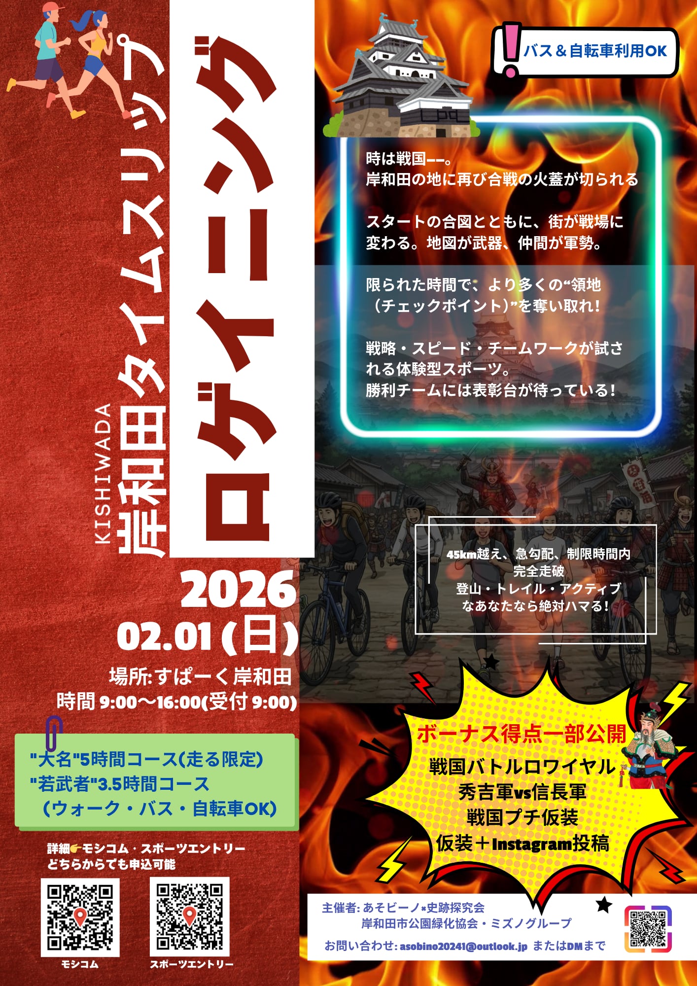 大名コース(ハード・走る限定) 岸和田の町から山へ、標高差587m・45km超の本格ロゲイニング。史跡を巡り己の限界に挑む戦国級チャレンジ。